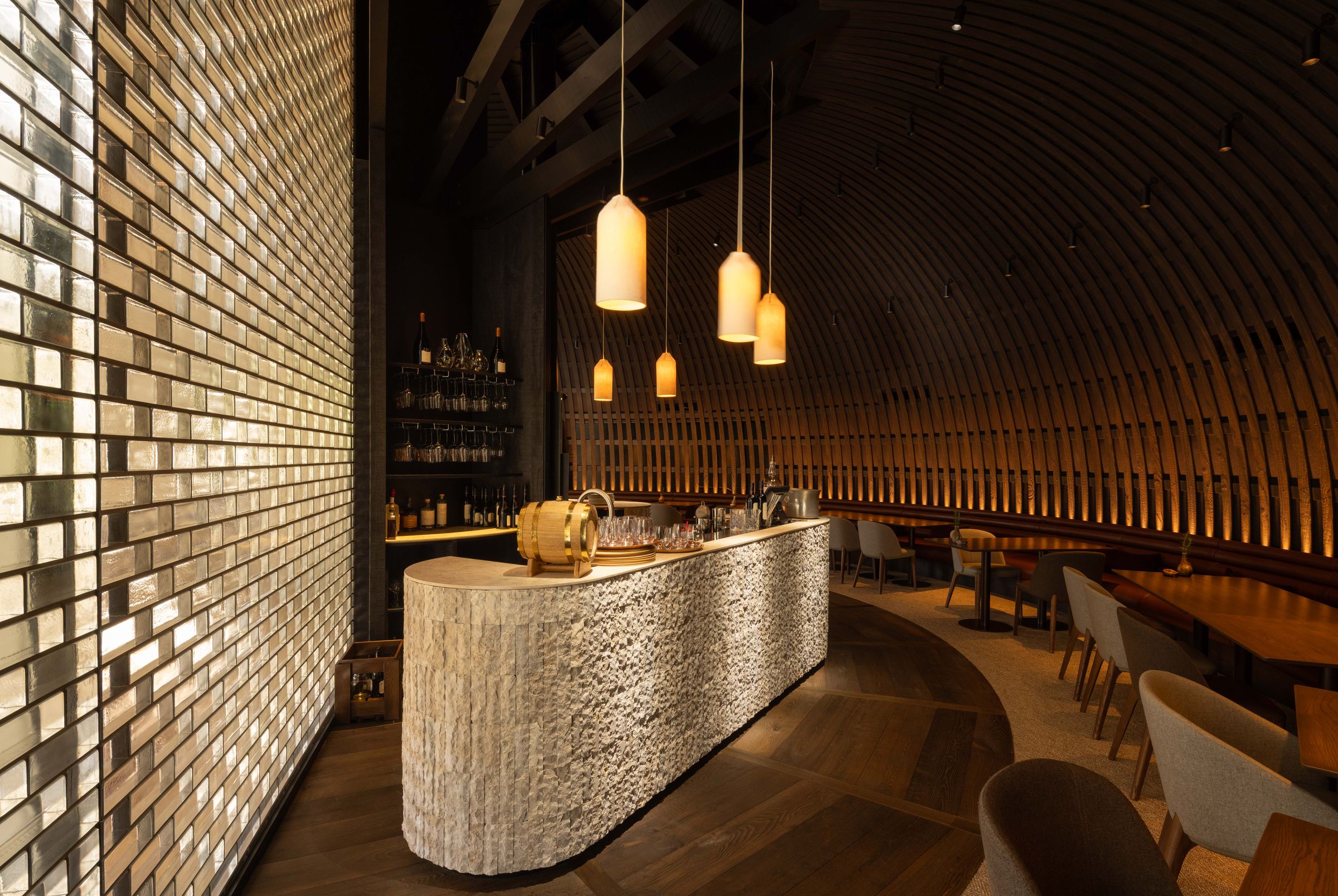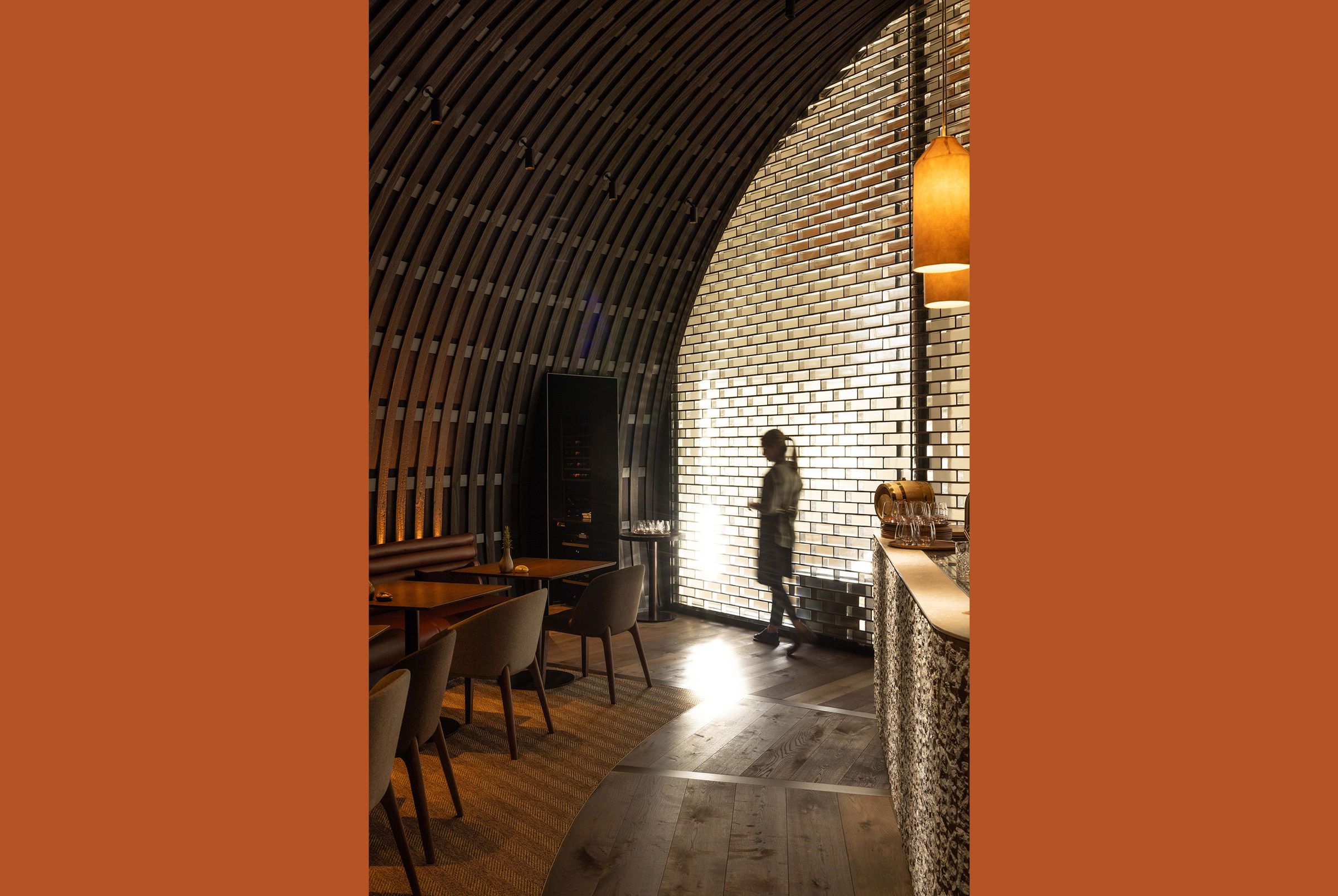 Fire – Drawing reference to the exothermic reaction in cooking and also used in a cooperage where oak barrels are flamed and charred. The conical space creates a nest around the guest like the inside of a charred wine barrel. Burnt timber battens fan out to embrace each diner equally around a singular banquette.