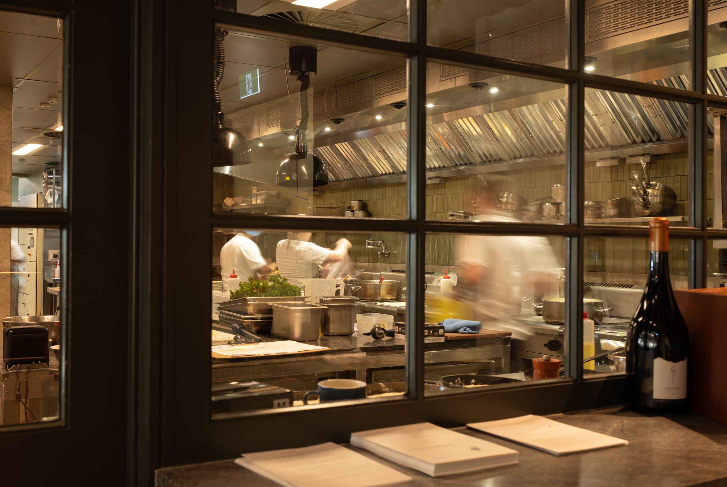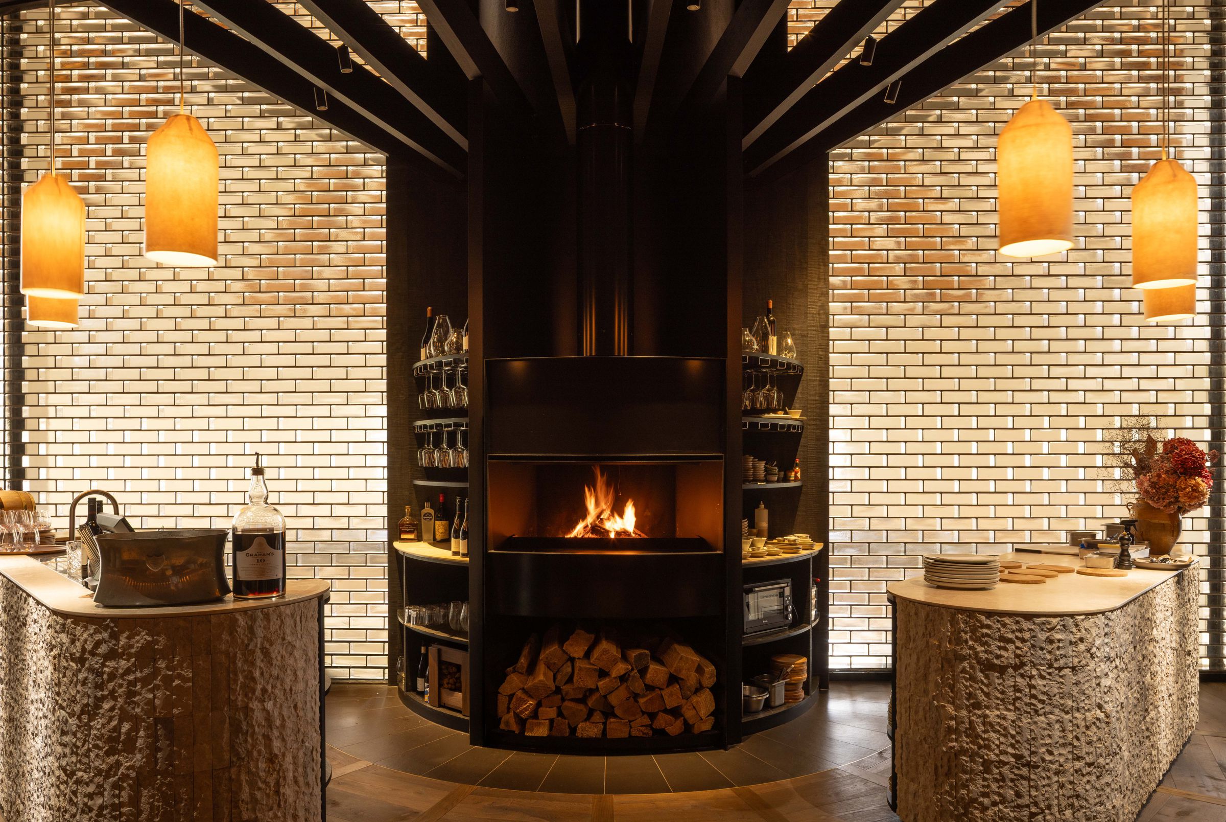 At the center of the space is a theatre of crackle that one views as the chef works in front of an open fire, elevated for all to experience.