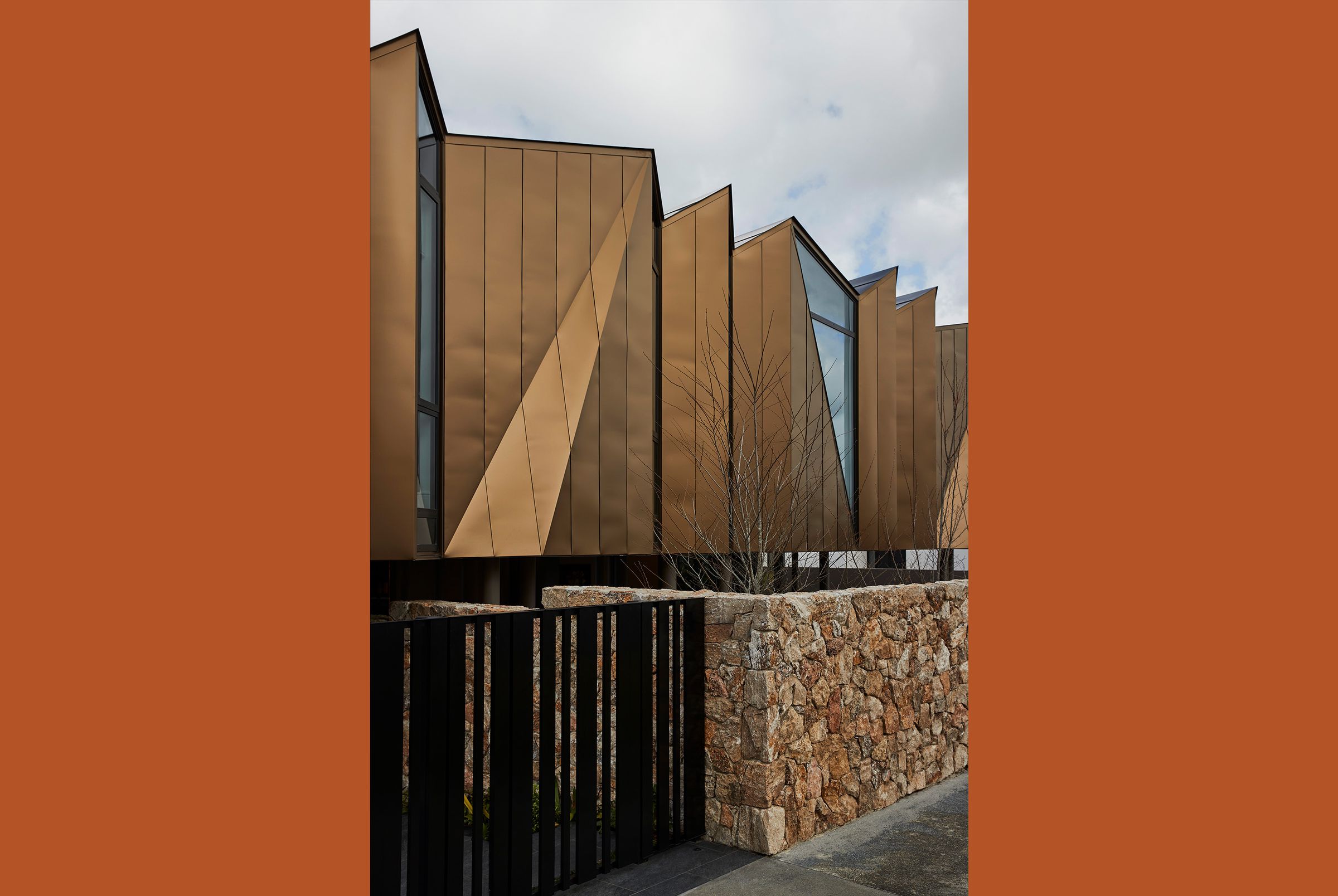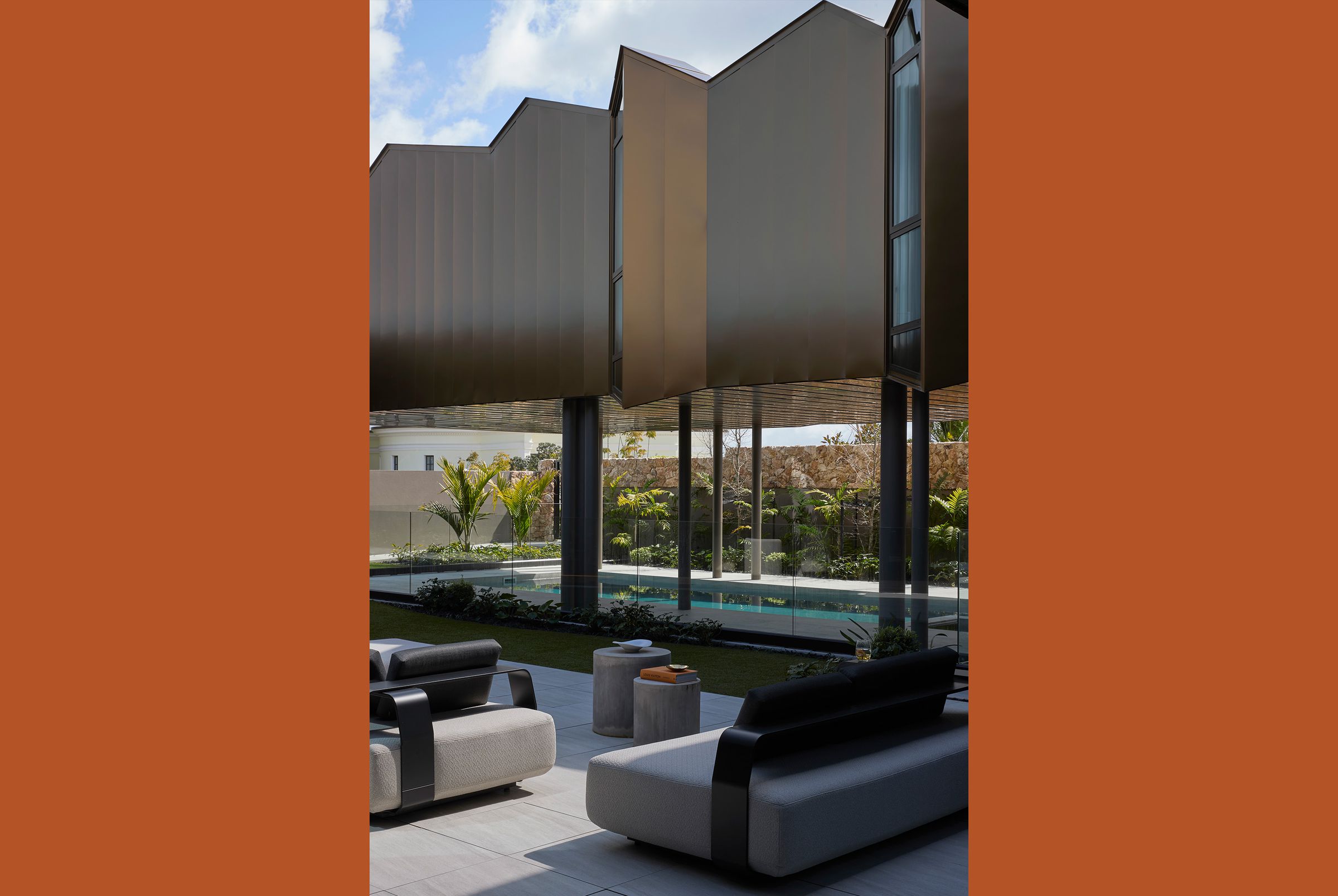 Conceived as a courtyard home, the residence features a metaphorical folded cloud hovering over a private garden. The sculptural upper floor, clad in bronze stainless steel, reflects and glows as the sun moves, modulating light and shadow throughout the day while casting shade over the courtyard and pool. The ground floor sits as a simple pavilion, flowing effortlessly from indoor spaces to outdoor entertaining areas. Bedrooms in the “cloud” above provide private retreats, separate from the vibrant communal spaces below.