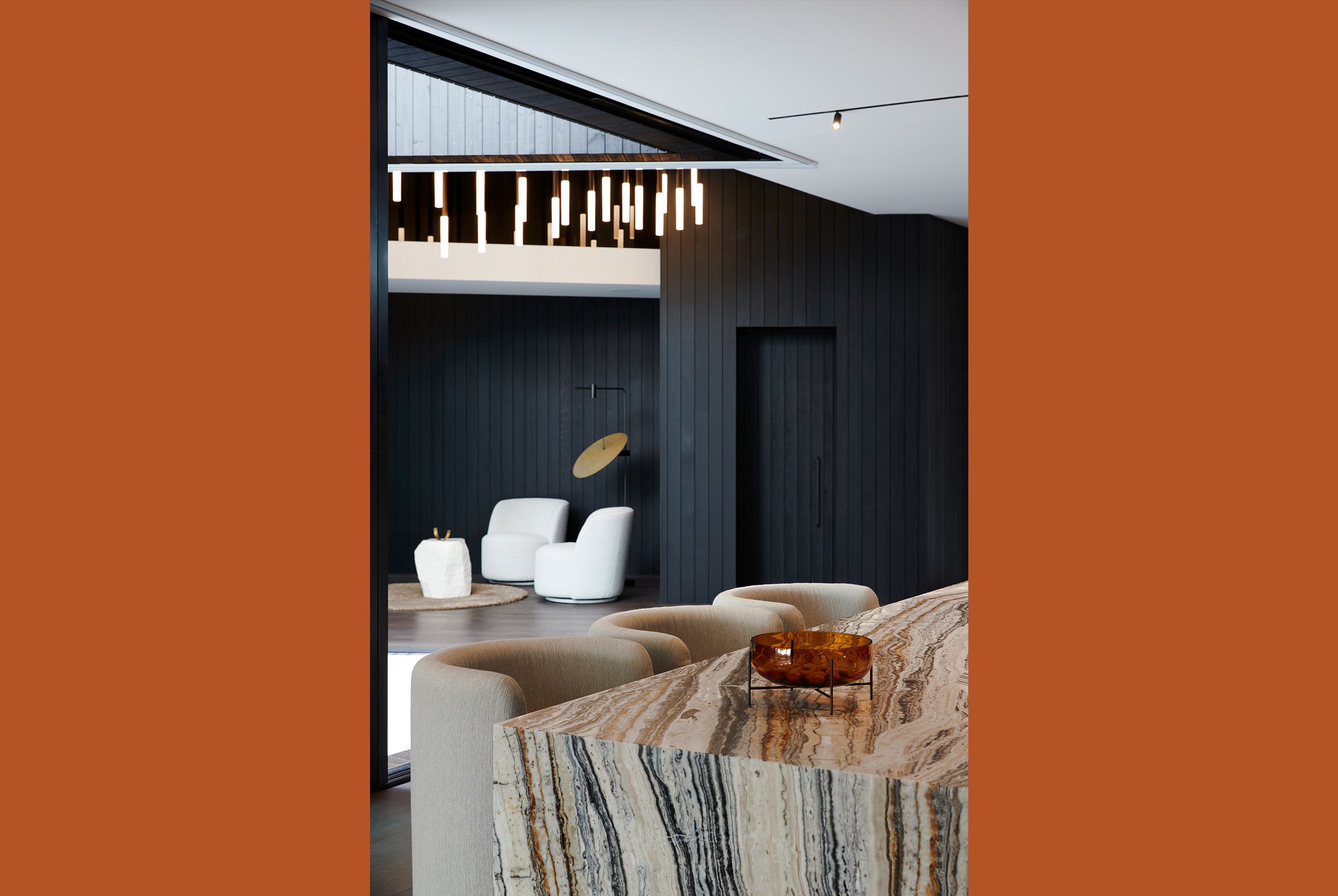 A basement car-turntable accommodates six vehicles, keeping access discreet and unobtrusive. Interiors are arranged to balance openness for family and entertaining modes with privacy in retreat modes. Dark-stained cedar, bronze tones, and stone finishes add warmth and texture, complementing the sculptural exterior.
